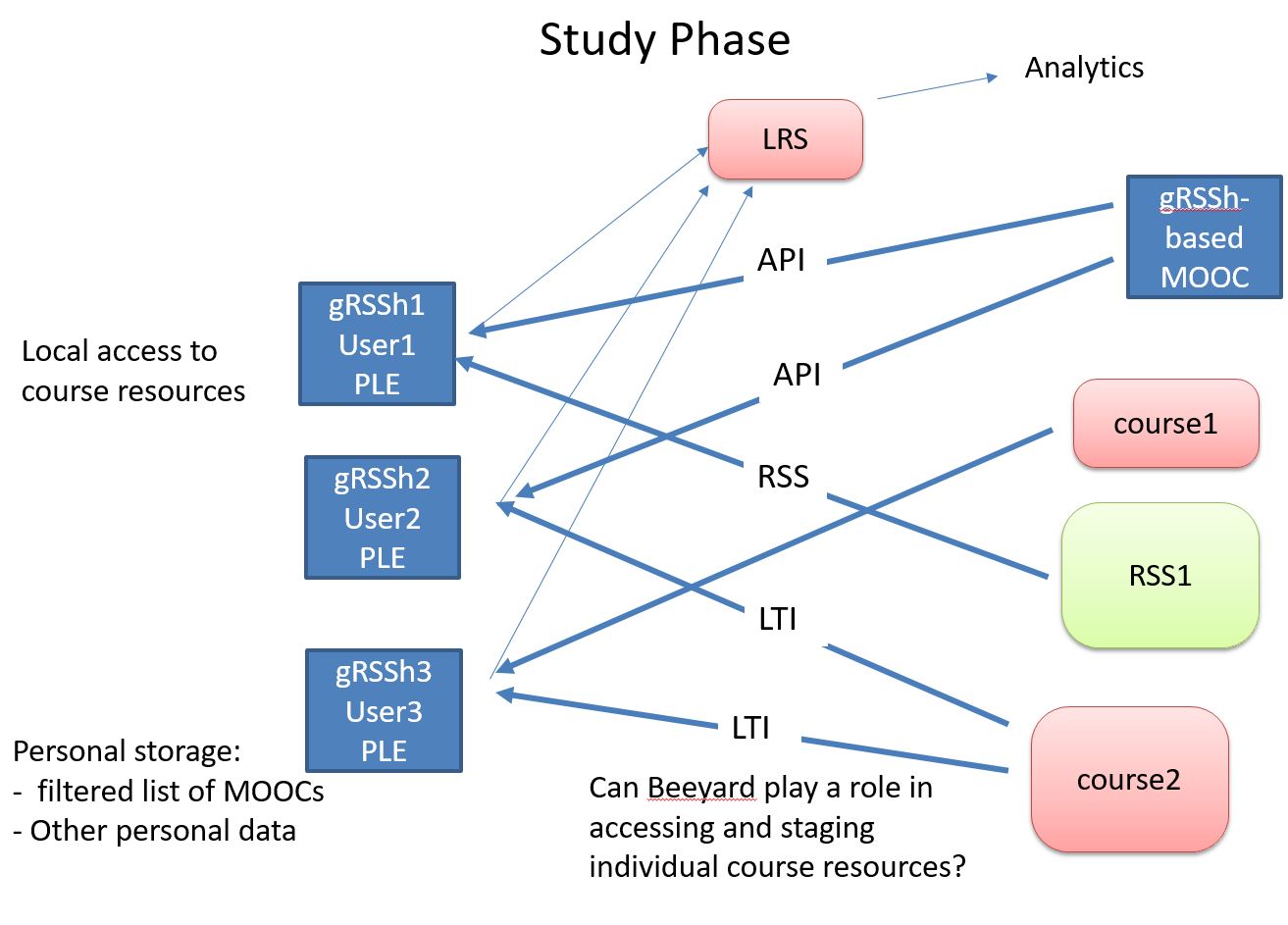 As we can see, individual users in their own gRSShopper instances access one or more courses or MOOCs from different providers. Various specifications - API, RSS and LTI - are used to deliver learning resources (or even entire courses) to them. The users work with the courses, interact with each other and with external services, and can even do things like log their activist in an LRS.
