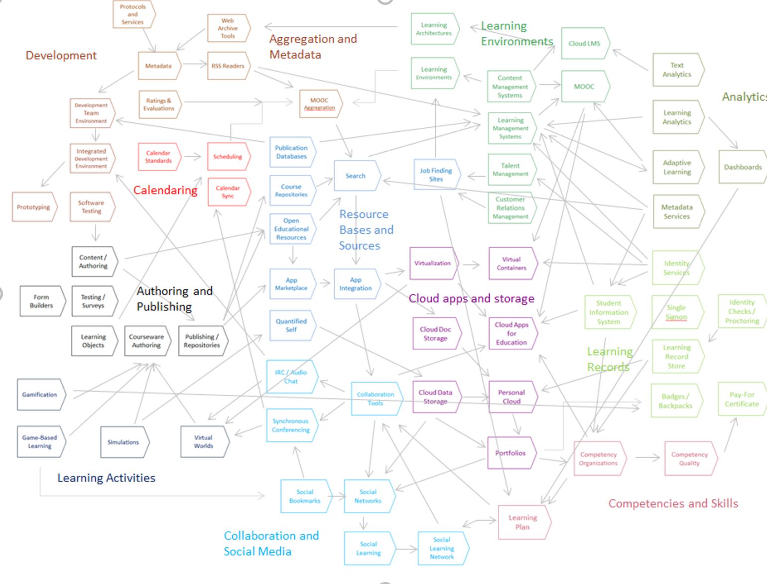 is an early outcome of the Landscape project. It includes some elements you might expect to find in a learning technologies landscape - learning analytics, competencies and skills, etc., but also a lot of the supporting environment less commonly considered, such as development tools or cloud apps and storage.