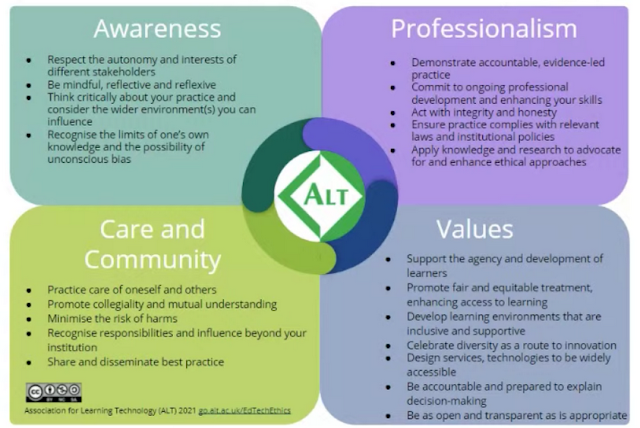 So that brings me to the Association for Learning Technology (ALT) Framework for Ethical Learning Technology (FELT), discussed in this white paper. Similarly, ALT opts "to articulate a framework for ethical professional practice in Learning Technology, not a set of rigid rules that apply to particular tools, technologies or contexts." Its focus is "the broad range of communication, information and related technologies that are used to support learning, teaching and assessment."