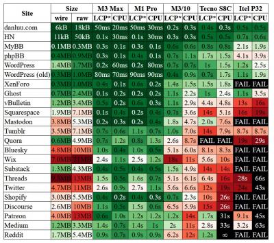 Web bloat is something I take seriously because it impacts both cost and performance. If the reader is using a slower or less powerful device, accessing online services can be difficult or at times impossible (think about how unresponsive some shopping or airline sites are, for no good reason). This article looks not only at page size but also at how much of a load the page imposes on your computer once it has downloaded. For comparison with the web sites on the chart, my own home page comes in at about 140 kilobytes (0.14 mB). There's no Javascript on it and it doesn't have cookies. It should load easily just about everywhere (in my office it loads at 640 ms). The same can't be said of everything I build, though. But I don't stop trying. Via Molly White.