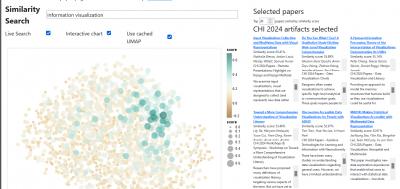 This is a tool that allows you to search for relevant topics from among the 1763 papers presented at the ACM CHI Conference on Human Factors in Computing Systems (CHI 2024) conference. It returns a similarity graph plotting the most relevant matches to your search. You can filter for specific paper tracks and, interact with the scatterplot to explore the different papers. "The system works by computing sentence embeddings on the papers text, then applying dimensionality reduction on the embeddings to compute the scatterplot. You can even change the dimensionality reduction and embeddings algorithm and parameters." You may also enjoy the way the source code for this is presented. It calculates "CHI 2024 papers similarity using sentence embeddings via HuggingFace Transformer.js and dimensionality reduction methods using Druid.js."