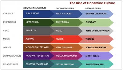 I know it's a nice appealing theory. "(Social Media services) all built not on engagement, connection, conversation or discussion but on distraction via little hits of dopamine." We're fed little bits of happiness and we go after them more and more - and then we're hooked. But how well does this theory apply to real-world examples. Tim Klapdor offers a chart of other things reflecting 'the rise of dopamine culture' showing an evolution from 'slow' to 'fast' to 'dopamine' in things ranging from athletics to video ro relationships. But I don't really think the chart holds up - not, at least, unless you feel slow-culture artifacts like newspapers, film, and handwritten letters are intrinsically better than the alternatives. And I don't.