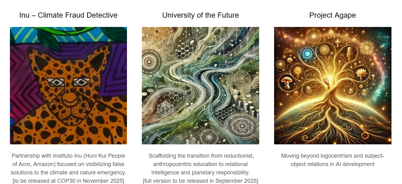 I'm not sure what to make of this exactly, but MetaRelationmal AI describes "Emergent Intelligences ("bot-lets") stabilized in a meta-relational paradigm through ontological inference." Whatever that means. Some examples: "University of the Future... Scaffolding the transition from reductionist, anthropocentric education to relational intelligence and planetary responsibility." And "Inu – Climate Fraud Detective... Partnership with Instituto Inu (Huni Kui People of Acre, Amazon) focused on visibilizing false solutions to the climate and nature emergency." No, you're with me - 'visibilizing' is not an actual word. Or: "Project Agape... Moving beyond logocentrism and subject-object relations in AI development." If you chat with one of the projects (as I did) we see quickly it's a designed ChatGPT interface. I mean - I'm probably pretty sympathetic with the aims and objectives of the projects here. But I do think it's important to write with some regard for the reader. Via Anne-Marie Scott.