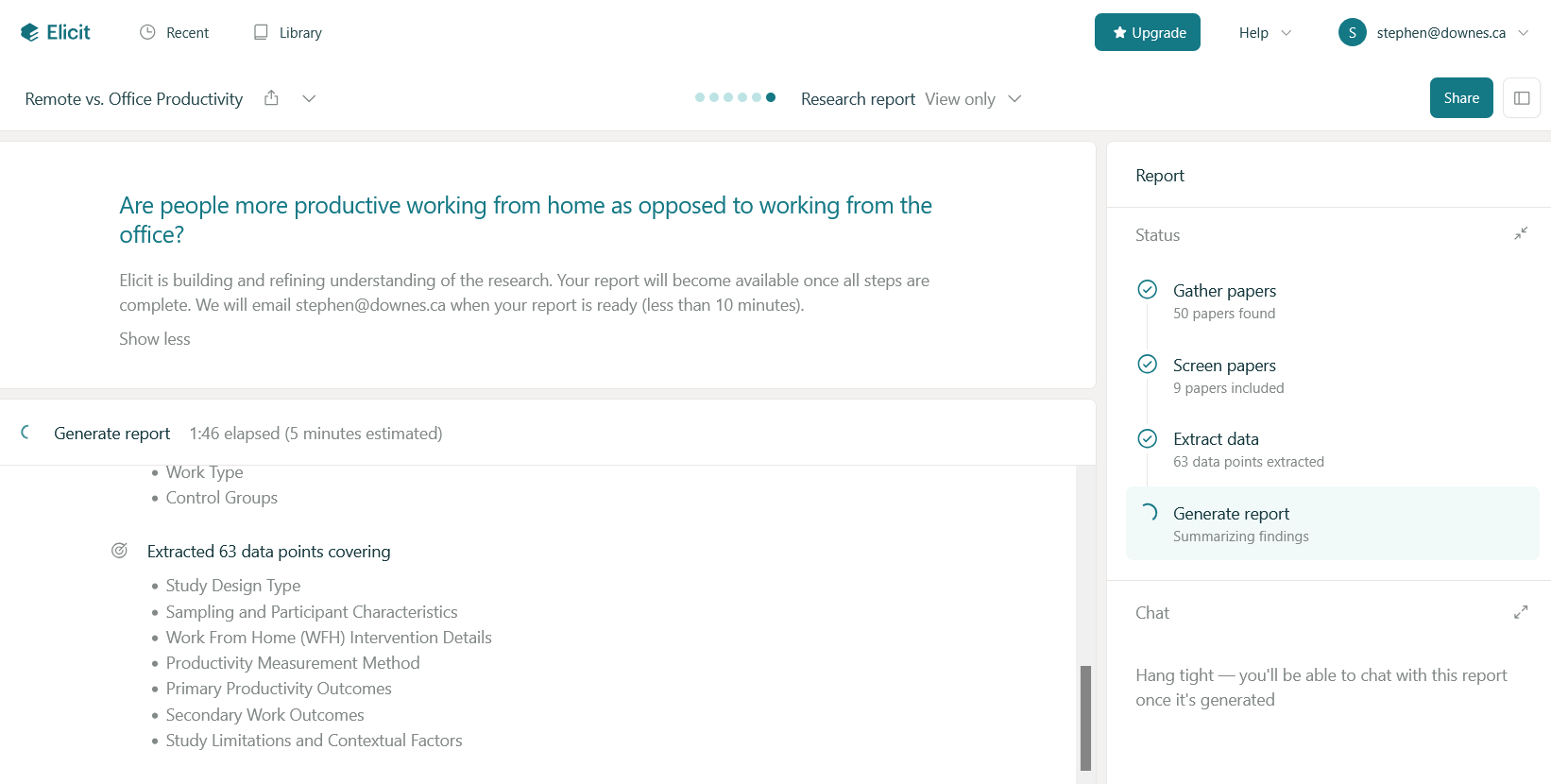 This is a 100% AI-generated paper I created in about ten minutes this morning on a subject of interest to me using the free version of Elicit's research generator. My prompt was nothing more than the title of the paper. It summarized results from the top 10 papers it found on the subject; a paid version would summarize results from many more papers. What did I learn? I should sort the research results better - the Atkins papers, for example, reported lower productivity, but on viewing the paper, I see a base pay of INR 8500 ($US 128.80) per month. I was motivated by an HBR webinar and a newsletter from Algorithm Watch on international gig work, both in my email today. Overall the Elicit work was pretty good, but I did note that while it's producing research summaries, it's still a long way from going out and doing the actual research studies that are being summarized.
