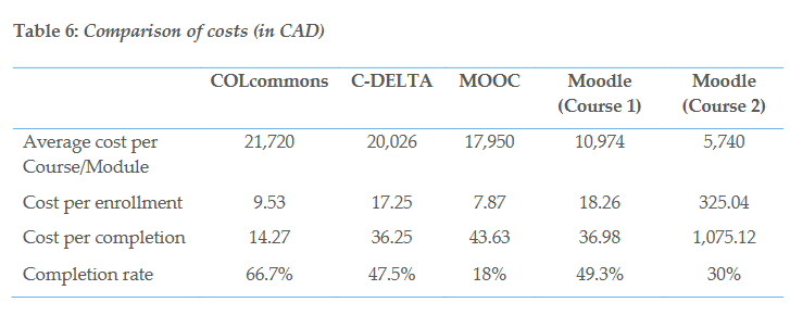 This paper presents an argument that "online learning need not be costly for learners and institutions." This runs contrary to a lot of what we read in the literature, though I would add that one of the reasons we developed our MOOC the way we did was that we didn't actually have a budget. Just some time and web servers. Anyhow, in this paper (13 page PDF) Sanjaya Mishra draws from four case studies involving the Commonwealth of Learning (CoL): just-in-time online learning, a self-learning platform for teachers and students, a MOOC, and Moodle courses. With the exception of the second Moodle course (which only had 13 completions), the cost per completion ran between $CAD 14 to 43. With numbers like these it basically doesn't make sense to charge for tuition.