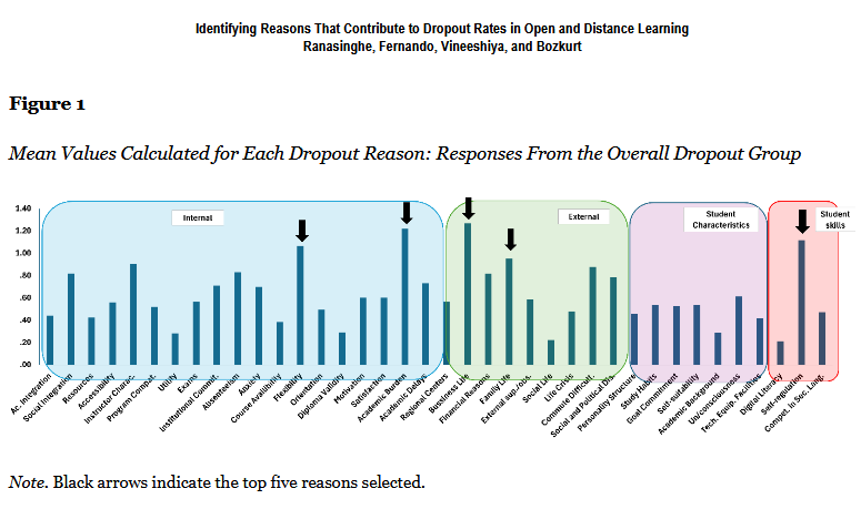 The conclusions outline here (22 page PDF) accord with my own experience in online learning. "The most influential reasons were job and family commitment, workload, time management, and flexibility, indicating that employed students were the more severely affected fraction of the dropout population." The prevalence of these factors is what has led me in the past to encourage the development of local support centres - part of the Triad model - to help learners manage their way through these factors.