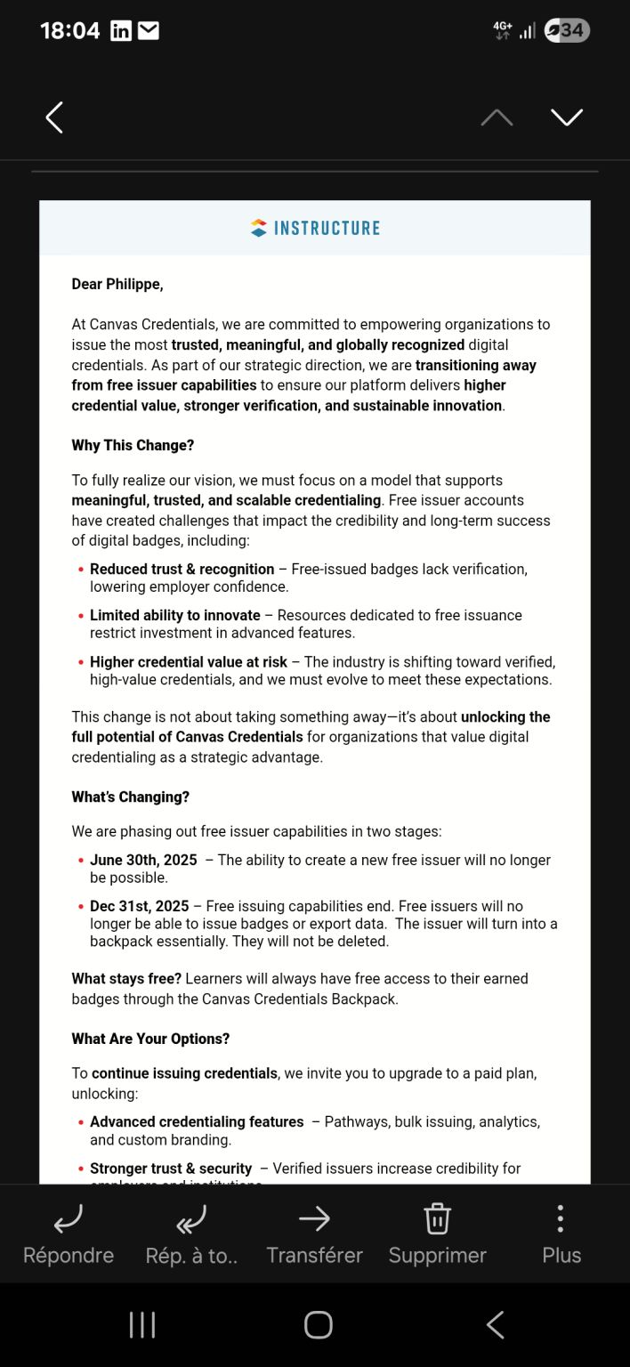 Doug Belshaw summarizes, "Instructure acquired Badgr a few years ago and renamed it to 'Canvas Credentials'. They're now instituting pay-to-play for badge issuing, but there are plenty of alternatives, including those listed here." The image provided by Philippe Petitqueux on LinkedIn seems to confirm this, although there are no press releases or statements yet on the Instructure website. Free issuers will no longer be allowed to be created June 30, and the whole free issuer system shuts down December 31. This yet another reminder not to trust platforms for any critical functions.