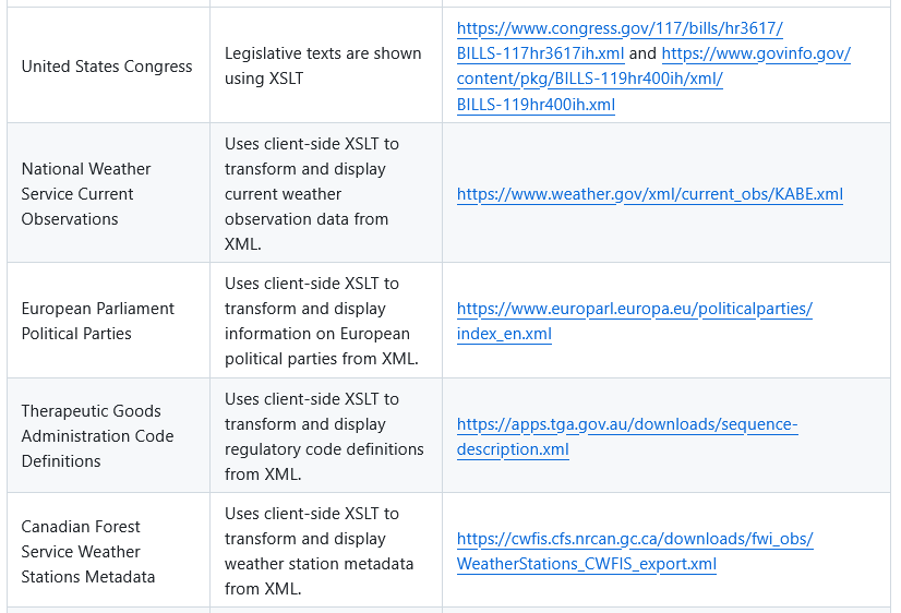 Some time in August some companies (read: Google) proposed the removal of the XML stylesheet language, or XSLT, from the HTML specification. There was a slightly delayed reaction (it was, after all, August) but then people began to push back. This post in the HTML 'issues' section (now 'closed') raises some of them, and lists a variety of places where XSLT is used. Of particular note: "There's no public record for the decision. The only publicly available discussion you linked to clearly states that the numbers are not low enough, people will object to this decision, and that the discussion should be postponed. There's no investigation into the long tail of web sites, of how many exactly would be broken etc."