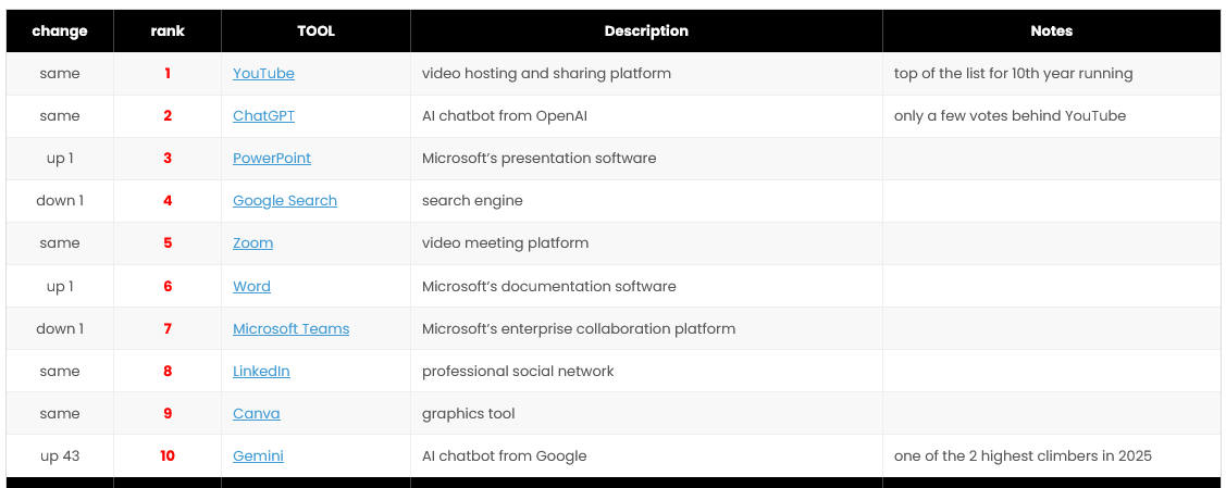 Jane Hart has published her "Top 100 Tools for Learning 2025 generated from the 19th annual digital tools survey." The only real change in the top 10 is that Gemini, Google's AI Chatbot, has joined ChatGPT near the top of the list (pushing Wikipedia to 11th and Google Docs to 12th).