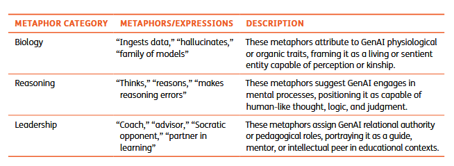 This is an interesting paper (13 page PDF) that looks at three major types of metaphor people use to describe generative AI: biological, reasoning, and leadership. Obviously there's some cross-categorization here (they all describe AI in terms of human function) but the discussion is generally well-grounded and considered. Still - I think the authors focus a bit too much on the differences between the original and the metaphor, where the real importance lies in how they are the same. I do mostly agree, though, with the proposed characterization: "describing GenAI as a "library that retrieves and recombines information based on patterns" (noting that the term 'library' itself is also a metaphor).