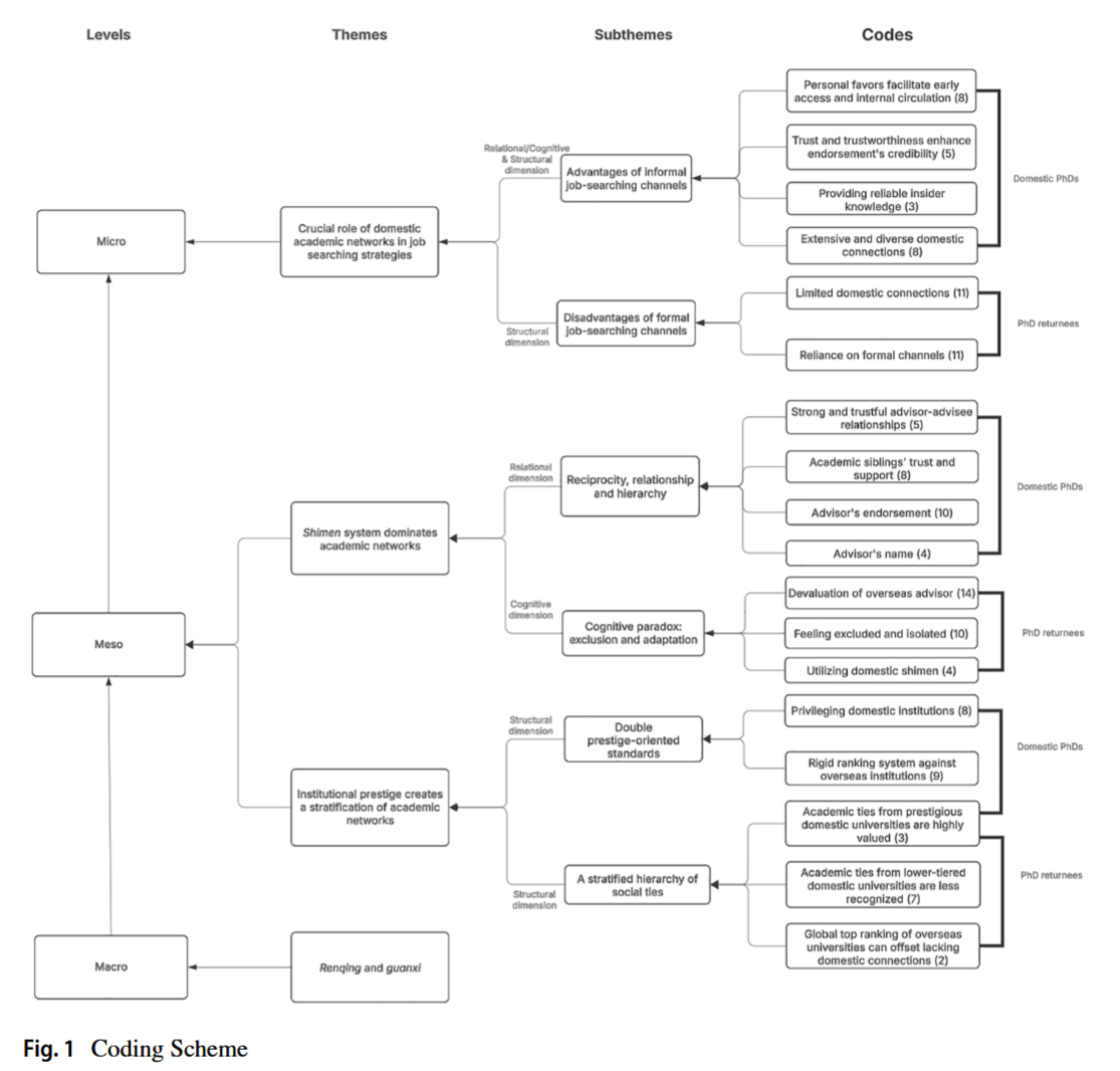 I have often expressed the opinion that the major value of an Ivy League education is the network of connections students develop, as opposed to a (fictional) difference in the quality of their education. This article explores that idea, but in a very different context: China. As such it names and describes the system of sociel ties that confer an advantage to students who study under a well-connected advisor in the domestic university system, as opposed to those who travel overseas to study in western institutions. "Domestic PhDs benefit from deep-rooted local networks, particularly advisor-related ties (shimen), institutional prestige, and informal job-search channels... Underpinning these dynamics is China's renqing society (a moral system of intimacy, reciprocity and obligation), where guanxi (personal connections embedded in trust, exchange, and hierarchy) remains central to academic recruitment. More research with much larger populations would be required to show how pervasive these factors are.