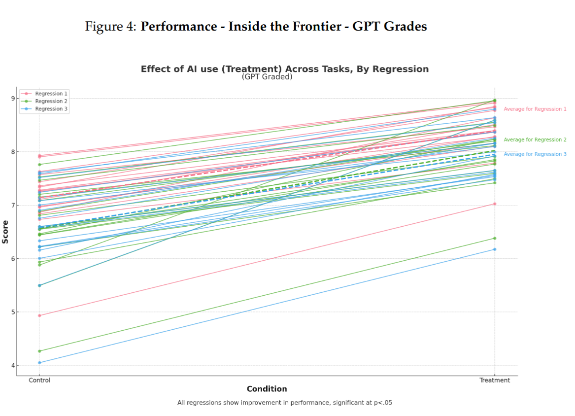 Rose Luckin cited this paper (58 page PDF) today, and though it's a year or two old, it still makes some interesting points. The authors were trying to measure how much (if at all) the use of AI would improve the performance of people performing some standard business consultation tasks. They broke down the tasks into two types, separated by a 'jagged frontier': those based on existing knowledge (from the perspective of the AI), and those extending beyond it. The results were to be expected: a performance improvement across the board, but with increasing error as the frontier is breached. The authors also identified two ways to use AI: 'Centaur behavior', where tasks are allocated according to the strengths of AI or human; and 'Cyborg behavior', where humans "intertwine their efforts with AI at the very frontier of capabilities." The thing to keep in mind is that the 'jagged edge' is a moving target. Today the knowledge of an AI is limited to "every book ever written". In the future, an AI will experience the world directly, without human interpreters.