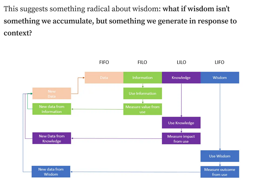 I like the way this article topples the 'wisdom' pyramid. Consider AI: it "doesn't climb a virtual digital pyramid from data to information to knowledge to wisdom... Instead, it processes patterns, generates responses, and creates what appears to be wisdom through statistical relationships between tokens." This raises the question: why do we suppose humans are any different? "Perhaps the hierarchy we've constructed is less about the nature of information and more about how we've chosen to categorise our own cognitive processes." Perhaps "the process of generating appropriate responses to complex situations doesn't require climbing a hierarchy at all... Perhaps the value isn't in the accumulation but in the generation; not in reaching the summit, but in developing the capacity to respond thoughtfully to whatever terrain we encounter."