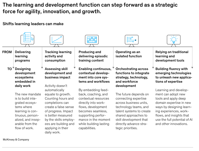 This article is less about the 'new mandate for CLOs' than it is about what it calls the 'new paradigm for workplace learning', one where "Advanced technologies are now being deployed not only to assist agents in being more productive but also to coach them as they work... technology can embed learning into the flow of work, making development a natural and continuous part of the employee experience." Since this article is aimed at Chief Learning Officers (CLO) there's less emphasis on exactly how this is is done and more on priorities, alignment and case studies. For example: "Instead of identifying skills employees lack, learning teams can partner with business leaders to analyze how roles, workflows, and even organizational structures need to evolve to meet future challenges." None if this is wrong, from my perspective, but it also reads like an in-depth analysis of the tip of the iceberg. Via Mark Oehlert.