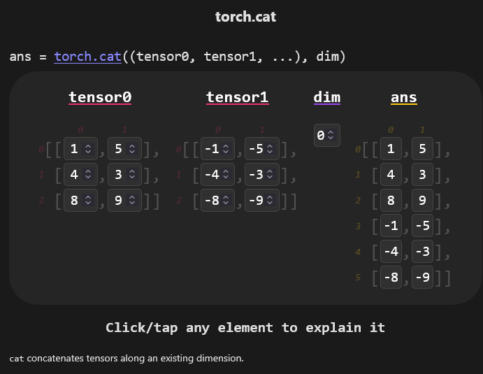 This website helps you learn what PyTorch functions do by showing them in action. PyTorch itself is an open-source machine learning library, and per Wikipedia "used for applications such as computer vision, deep learning research and natural language processing, originally developed by Meta AI and now part of the Linux Foundation umbrella." In order to benefit from this website you need to run through the examples and then actually think about what's happening in the simulation. torch.cat, for example, concatinates one tensor (which is a data strructure like an array or matrix) with another - and you can see them put together, one after another. Torch.minimum will compare two tensors and take the minimum value for each element. Do this sort of stuff with very large datasets and you get machine learning.