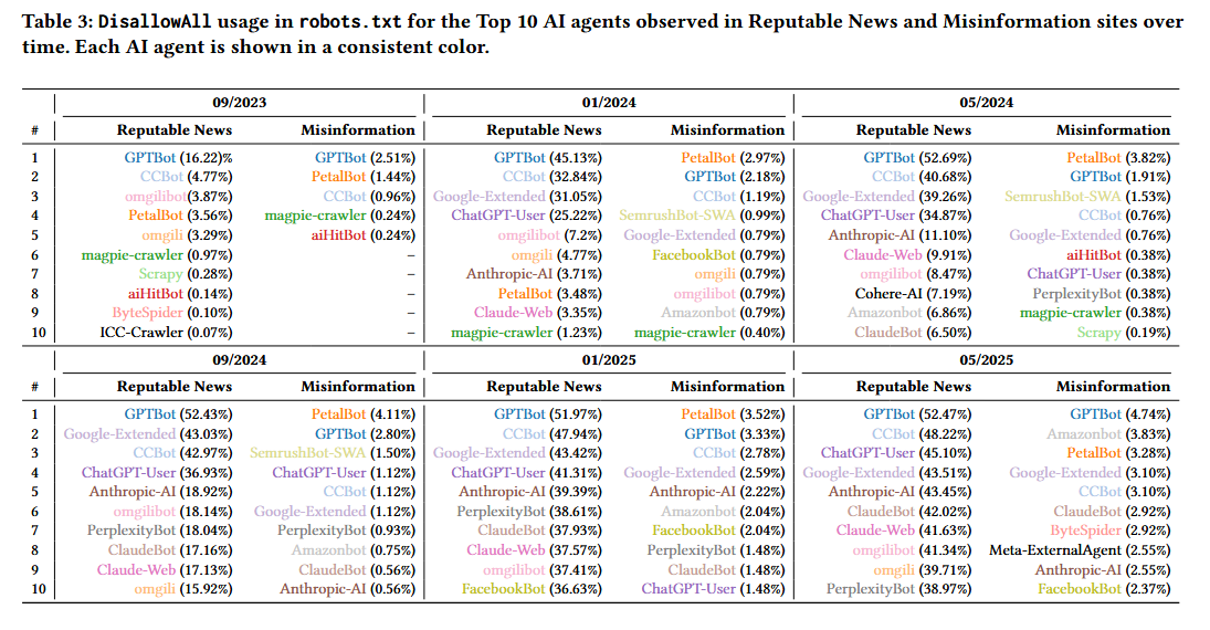 I have often used the phrase "democracy dies behind a paywall". It is of course a riff on the Washington Post's slogan that democracy dies in darkness, and both allude to the idea that democracy depends on timely access to accurate facts and information. This article gets at the other side of that slogan, that when access to trusth is blocked, falsehoods and misinformation flourish, with the consequent undermining of democracy. This article focuses on how genuine news sites and misinformation sites restrict (or not) access by AI agents and scrapers. Unsurprisingly, the misinformation sites are happy to welcome AI while "AI-blocking by reputable sites (increased) from 23% in September 2023 to nearly 60% by May 2025... raising essential questions for web transparency, data ethics, and the future of AI training practices."