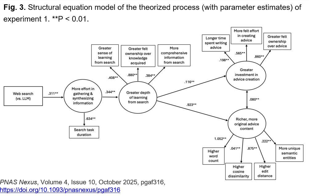 This article is a good example of why it's important not to generalize from a single study. Here's the story the study presents: "compared with those who used ChatGPT, participants who used Google search invested more effort in gathering and synthesizing information, as manifested in more time spent on the search task. This greater search effort led participants to develop deeper knowledge from their search, as manifested in greater felt learning from the search results, greater felt ownership over the knowledge they acquired, and thinking that the search results contained more comprehensive information on the subject." Now, is the effect the result of using AI? Or is it a result of different sources found through each search. I find Perplexity, for example, doesn't discriminate in search results the way I do when using Google. I skip over the churnalism, for example, while Perplexity does not. If I'm using Google Scholar, this distinction is even more pronounced. This study doesn't really trace the difference in effort to the cause, so it just blames the result on AI when it could be an entirely different factor. As the papers so often conclude, more research is needed.