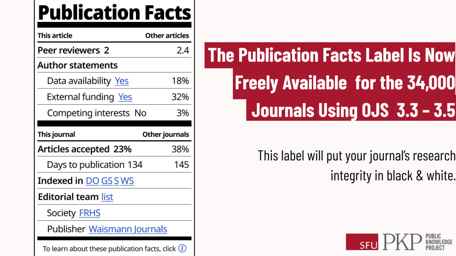 The major question this article raises for me is whether these are the indicators that reveal a journal's research integrity. The 'Publication Facts' label lists the following for each article: peer reviewers (#), data available (y|n), external funding (y|n), competing interests (y|n), articles accepted (%), days to publication (#), indexed in (links), editorial team (links), publisher (link), society (link). Some alternatives better revealing journal integrity might include: ethical review (y|n), author h-index (#), citations (#), same-journal citations (%), corporate funding ($), publisher profits ($), average sample size (#), diversity (%), and probably a few more I haven't thought of. Rather than viewing integrity in black and white, I'd like to see it displayed in full colour.
