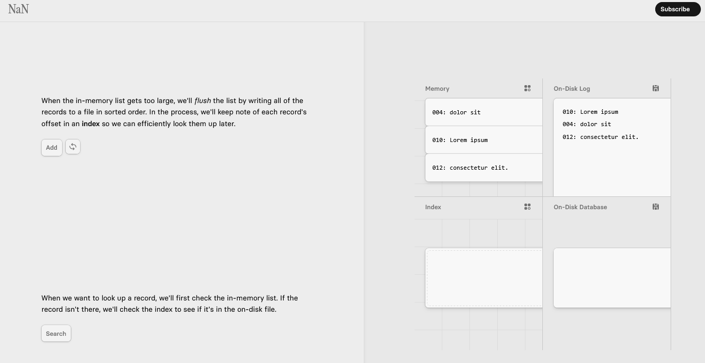 "If you were to build your own database today, not knowing that databases exist already, how would you do it?" This is a really neat article and visualization of how to build a key-value database from scratch. What I really like about it is that it takes you step by step through the thinking process - from the idea of just putting statements like '18=cat' in a text file to append-only databases to sorting and indices and search.