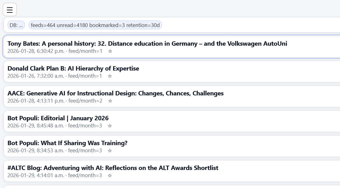 This post argues that designers have borrowed the design of previous communication systems and with that borrowed the appearance of an obligation to read, and maybe even to respond, to the backlog. That obligation may be real in the case of email or answering machines, where senders are (or at least, used to be) real people. But the obligation never actually existed for things like RSS feeds and social media - they became 'phantom obligations'. You might miss someone's important post. You might miss what's happening right now! It's a great post - and it makes us rethink the metaphors we use to describe what's happening on the internet in ways that free us from feeling guilty about not reading everything that exists. Via D'Arcy Norman, who looks at Fever's 'Hot' view of RSS, and made an interface of his own (me, I'm really enjoying my own version, that sorts recent posts according to how frequently the person posts, so I never miss the once-a-month gems in the noise of sites that publish eight items a day (like me, here in OLDaily).