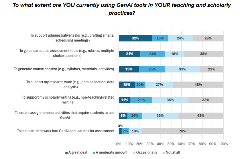 This is a relatively short document (9 page PDF) outlining a survey of post secondary institutions on potential AI use in education (see the methods here). "Survey respondents continue to foresee GenAI becoming a normal part of education, and an increasing proportion recognize its potential as a study tool. At the same time, concerns that GenAI will make teaching more challenging are also rising."