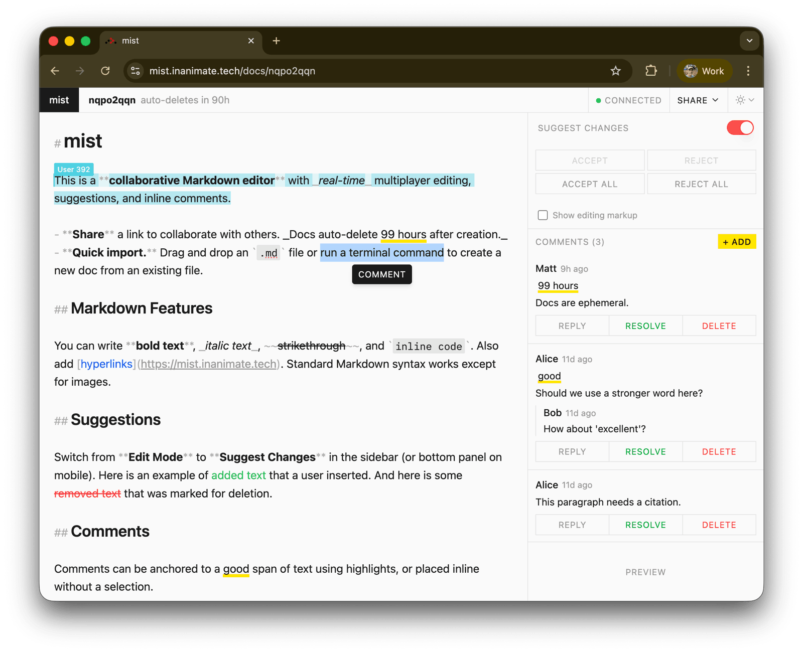 This is pretty cool: it's a collaborative markdown editor with a couple of interesting features: "all docs auto-delete 99 hours after creation. This is for quick sharing + collab"; and "Roundtripping: Download then import by drag and drop on the homepage: all suggestions and comments are preserved." Built over the weekend using Claude Code. And it reminds me or a remark I heard on TWIT: coding with AI is the best video game out there right now. "You know it's very addictive using Claude Code over the weekend. Drop in and write another para as a prompt, hang out with the family, drop in and write a bit more, go do the laundry... scratch that old-school Civ itch, 'just one more turn.' Coding as entertainment."