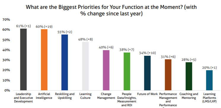 States, the UK and the Middle East. The results are not surprising. The top priority continues to be leadership and executive development, as ever, and close on its heels is artificial intelligence. Also, "In last year's data, the phrase 'skills-based organisations' came up more than twice as often as in 2024.... That persistence reflects the 'skills based' approach becoming part of the