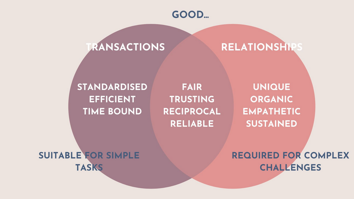 I spent some time thinking about this short article that explores "the difference between good relationships and good transactions" where a 'good relationship' is "unique, organic, and empathetic, helping us understand when to invest in building relationships versus when a transaction suffices." What made me think wasn't the distinction itself, which seems straightforward, but the terminology used. The way 'relationship' is defined blends elements of different constructs - we have 'unique' and 'sustained', which to me describes a 'connection', but in addition there is the presumption that relationships are embodied, as evidenced by 'organic' and 'empathetic'. The connection describes the relationship itself, while the embodied element describes the thing that is related. The transaction side, meanwhile, describes the exchange that happens between two entities, as opposed to the connections between them. The world view of this article doesn't grant (or doesn't require?) embodiment for transactions to occur. I would ask whether the author intended to distinguish between embodied and non?-embodied entities here, or whether it's just phrasing.