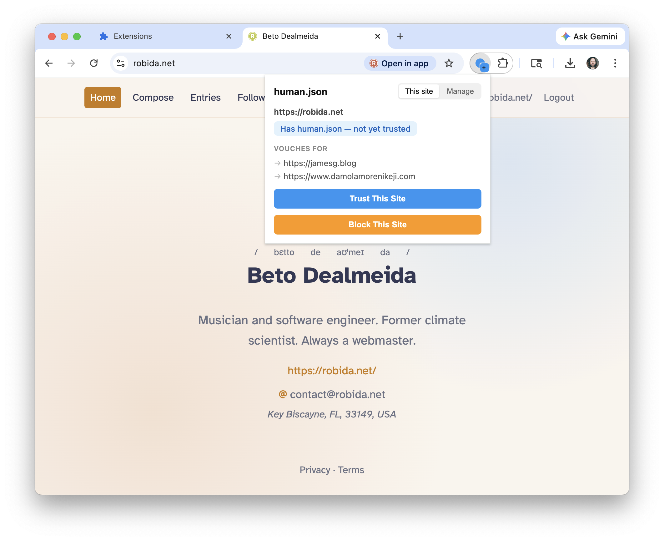 I have no idea whether this idea will take off, but I'm onboard with it. The idea is that people (real human people) who create their own websites can add a file called 'human.json' where they attest that their website is created by a human and vouch for other websites they know are created by humans. It should remind you of the old 'web of trust' and I now dub this the 'web of humans'. Using it is a three-step process: create a human.json file on your website (here's mine); put a link rel="human-json" into the header of your web page pointing to the human.json file; and then install the browser extensions for Firefox and Chrome to identify sites maintained by humans. Here are the full instructions. See also Alan Levine.