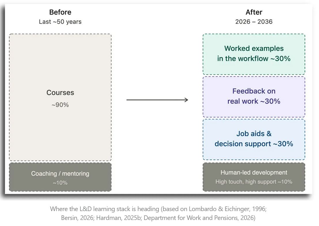 This is nothing readers here haven't heard before, but as Philippa Hardman says, AI is accelerating the trend and making the implications a lot more obvious. "Formal learning accounts for only 4-10% of how people actually learn at work," writes Hardman, and "only a fraction of what we 'learn' in courses transfers into changed behaviour. Put another way, we've built an entire industry and tech stack around the margins." So what will we get instead? I think we already know: "the learning moment is inseparable from the work... compliance courses for nudge learning and 3-10 minute mobile micro-modules embedded into normal workflows... (and) self-directed exploration and peer support." What does that technology look like?