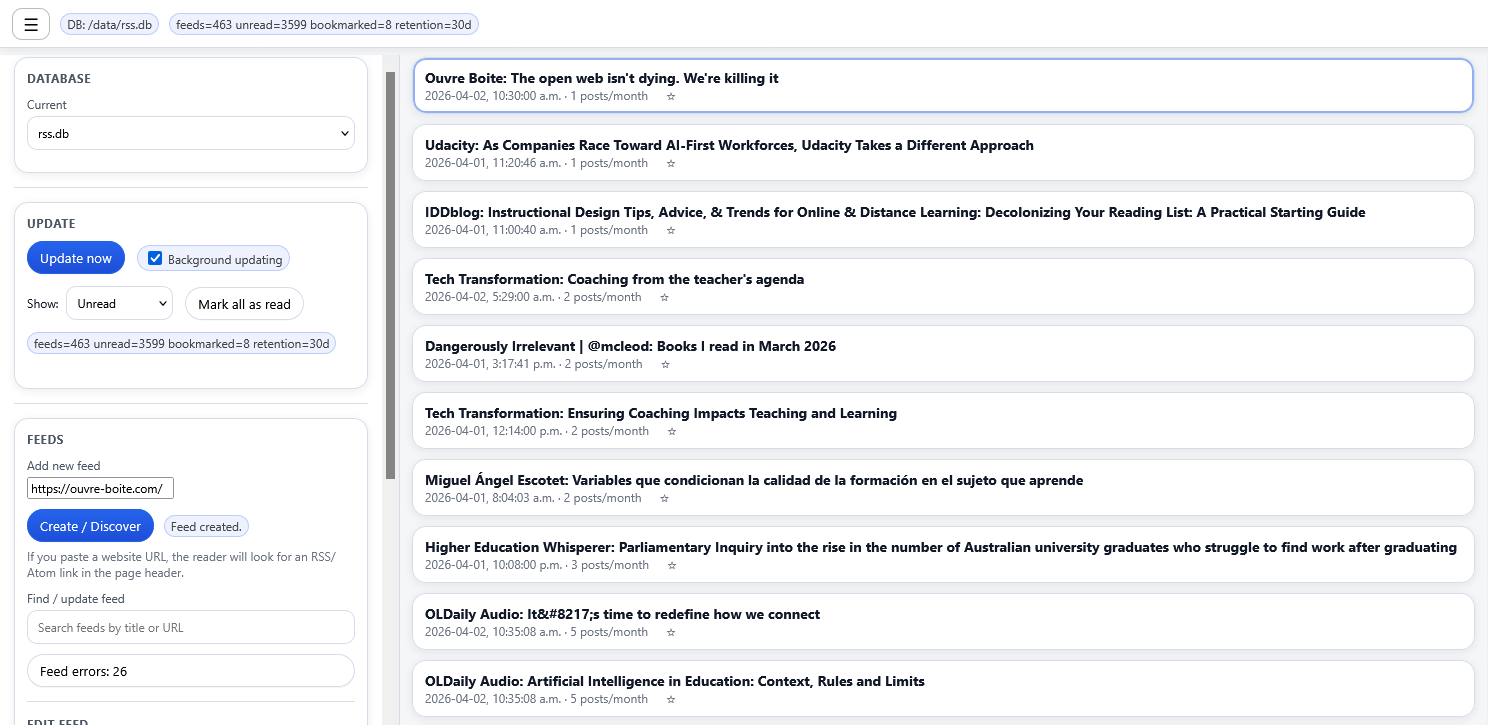 Julien Genestoux responds to Anil Dash's article, Endgame for the Open Web, and makes a point well worth making. "I think it is too easy to tell the story as if the open web was simply attacked from the outside. It also obscures the fact that we actually traded the web away." I think the history of RSS is a good example of this. We're told 'Google killed RSS' when they shut down Google Reader. But RSS never went anywhere; people just started using convenient alternatives like Twitter and Facebook. "Why did so many organizations (or even politicians) that loudly celebrated the open web still direct their communities toward closed channels as soon as growth, analytics, or convenience were on the table? Why did we keep outsourcing identity, distribution, and monetization to companies whose incentives were obviously misaligned with ours?" Image: screenshot of my LocalRSS app. Via Grant Potter.