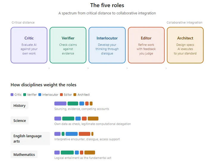 As I've often said, education researchers love a taxonomy, and this is another one, so I may as well pass it along. The five roles are: the critic, the verifier, the interlocutor, the editor, and the architect. "They are positions on a spectrum that runs from critical distance to collaborative integration, and the student's movement across them is shaped by context, by the demands of the task, and by the developing expertise the student brings to it."